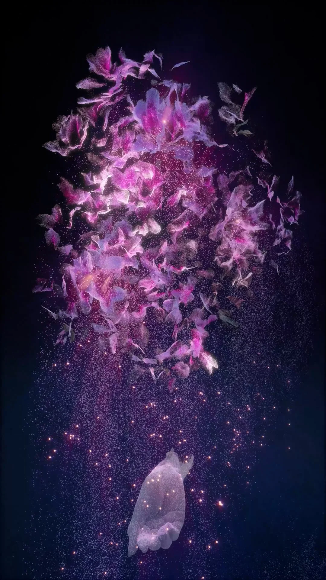 "Numinous Cloud: Azaleas" (2024) is an audio-visual installation exploring the exchange and dissolution of boundaries between human and ecological cycles. Meditating on entropy and the numinosity of all life forms, the work showcases a simulated flower cloud (sourced from LIDAR scanned data of an Azalea bush), releasing luminous dust toward an open human palm (sourced from the artist’s 3D scanned hand). Presented as a large-scale projection, viewers are able to stand beneath the flowing essence and experience a hypnotic cycle where natural breakdown becomes offering and human presence becomes a vessel for its continuous renewal.